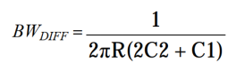 共模带宽定义为在两个相互连接的输入端与接地之间的共模射频信号的带宽。必须注意的是,C2不影响共模射频信号的带宽,因为该电容连接于两个输入端之间(有助于使其保持相同的射频信号电平)。因此,共模带宽决定于两个RC网络(R1a/C1a和R1b/C1b)的对地并联阻抗。–3dB共模带宽等于