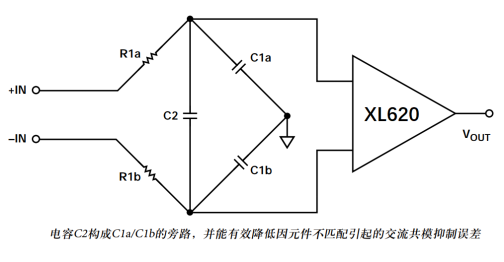 以前面XL620的应用电路为例,若C2=0.01μF,–3dB差分信号带宽约为1900Hz。当该电路增益为5时,其在10Hz至20MHz频率范围内的测得直流失调电压小于6μVRTI。在单位增益条件下,这种直流失调电压可忽略。